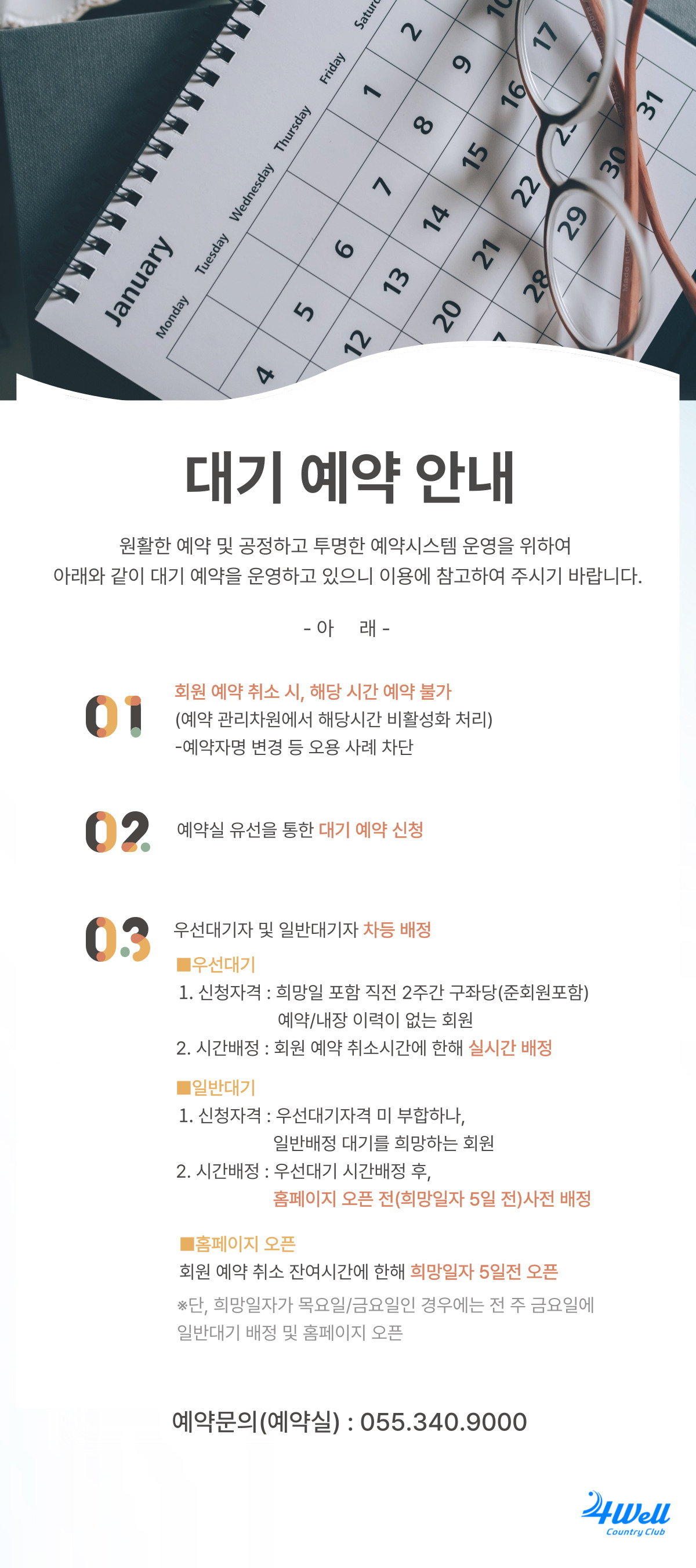 • 대기예약 신청은 확정이 아니며, 취소 시간에 한해 신청자격 확인 후 예약실에서 배정 될 예정입니다.